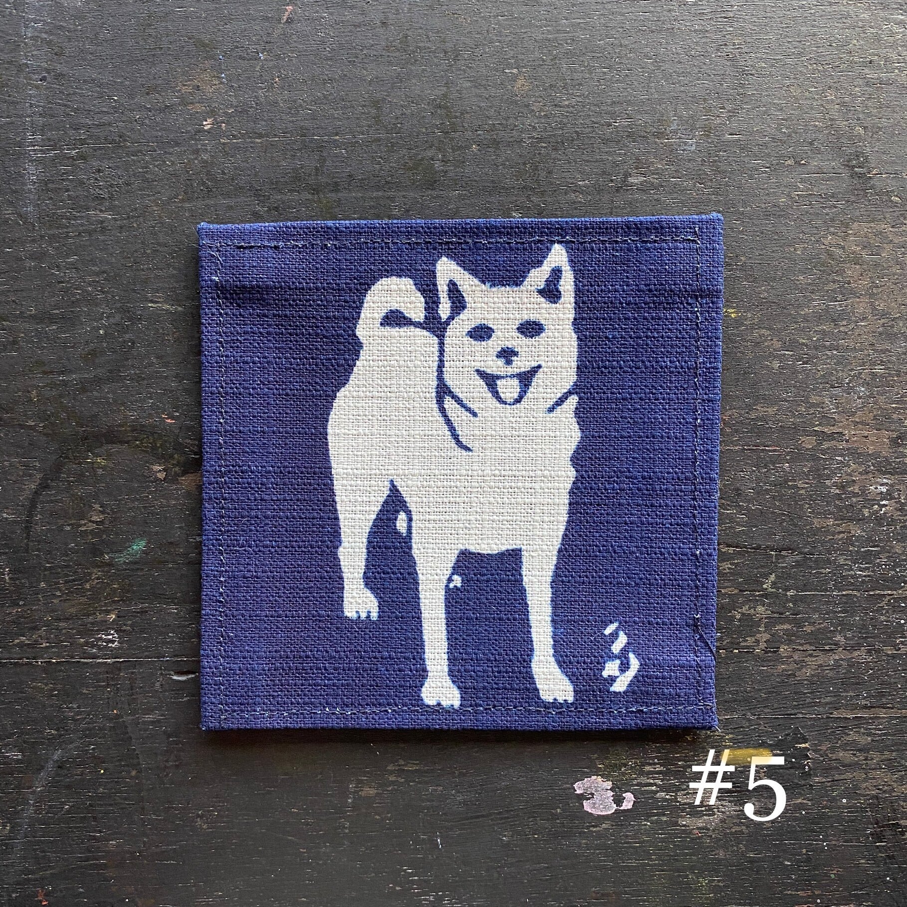 木綿に型染めで藍染めをした犬のコースターです。