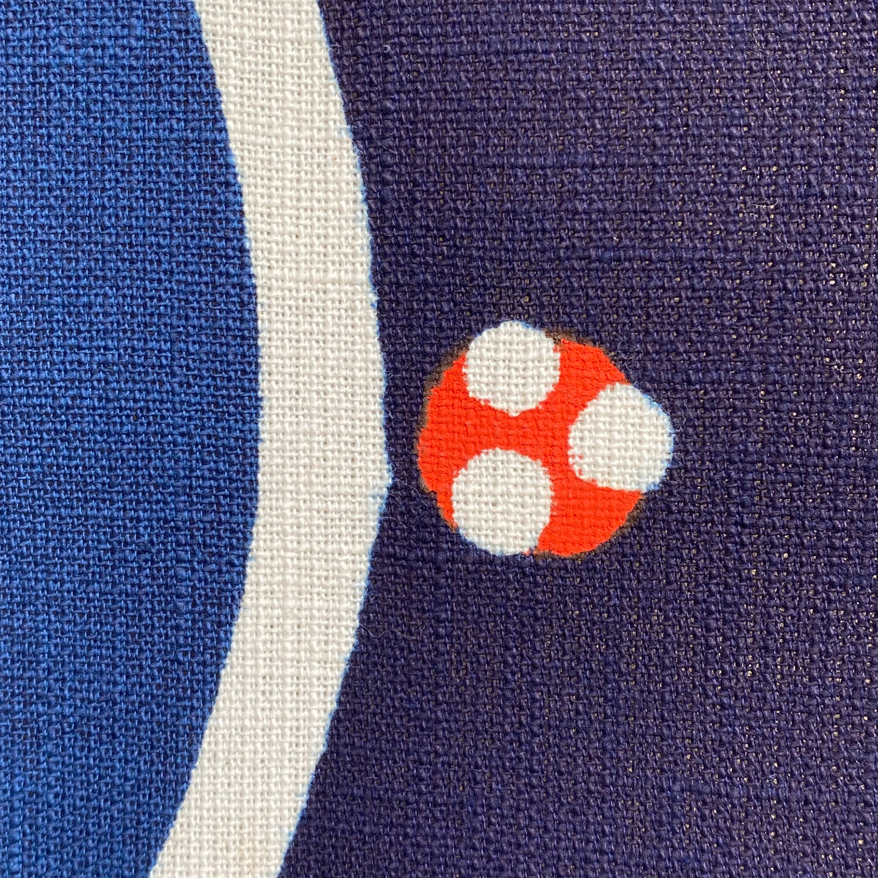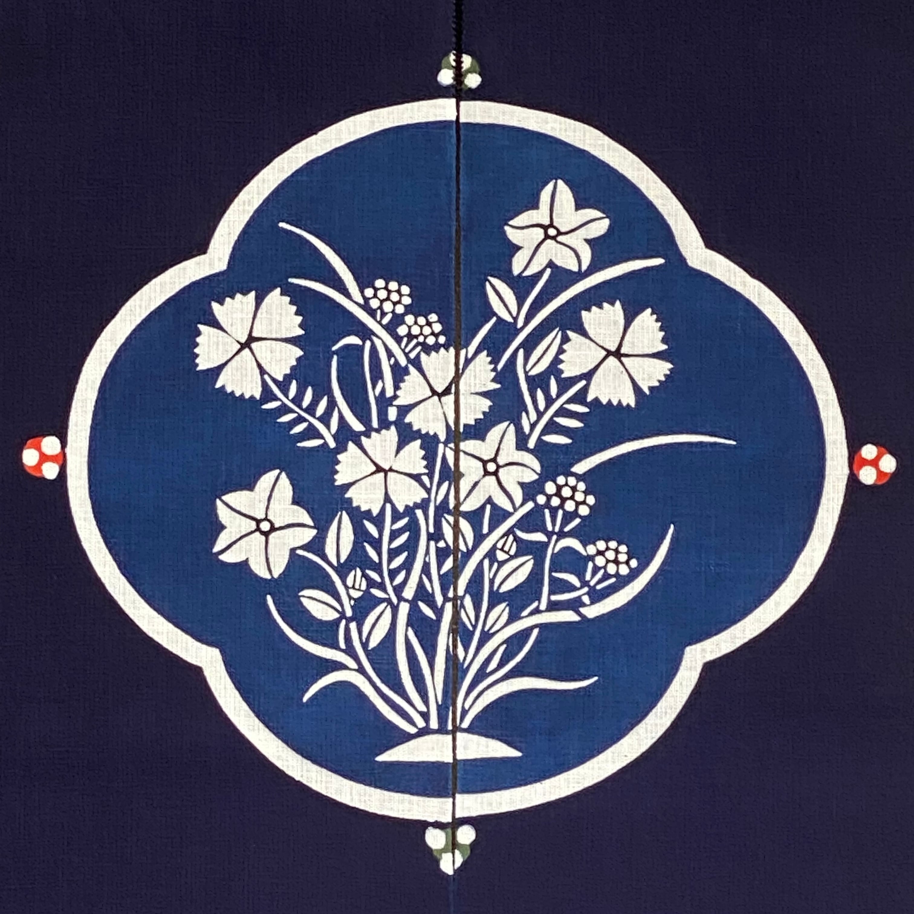 のれんに秋草の図案を顔料と藍染めで染めた作品になります。